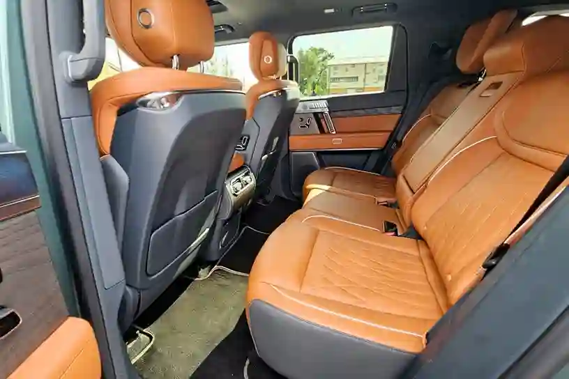 Забираться в салон помогают крупные ухватистые поручни и штатные пороги, которые в Китае могут быть оснащены электроприводом. Однако проход на задний ряд тут сравнительно узкий, хотя колесная база выглядит внушительно – 2950 мм. Конечно, места сзади хватает, до коленей при росте в 186 см остается запас в несколько сантиметров, над головой воздуха еще больше.